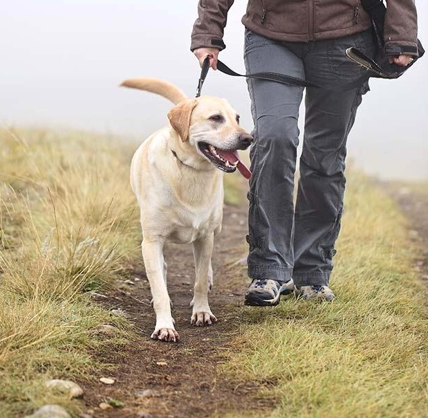 Met een vrolijk ‘Tot ziens, brave hond!’ en een aai over zijn kop neemt de wandelaarster afscheid. ‘Beterschap met je